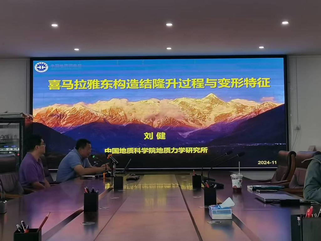 2024年11月13日下午,海洋与气象学院举行了2024年第15期海学论坛,本次海学论坛邀请了中国地质科学院地质力学研究所第四纪地质和生态与气候研究室主任刘健老师(研究员)在海科楼505会议室为大家带来喜马拉雅东构造结隆升过程与变形特征的学术报告。参加本次论坛的人员包括学院的孔德明、包创、武力等老师与多名海洋地质专业本科生。会议由我院武力老师主持。